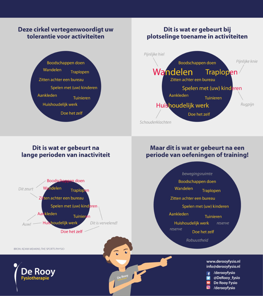 Dit is wat er gebeurt bij plotselinge toename van activiteiten. Wanneer we plotseling een activiteit gaan doen die we niet (in die mate) gewend zijn, dan is je lijf niet in staat om zich snel aan de eisen van deze activiteit aan te passen. Dit resulteert waarschijnlijk in (pijn)klachten, de belasting is te zwaar.